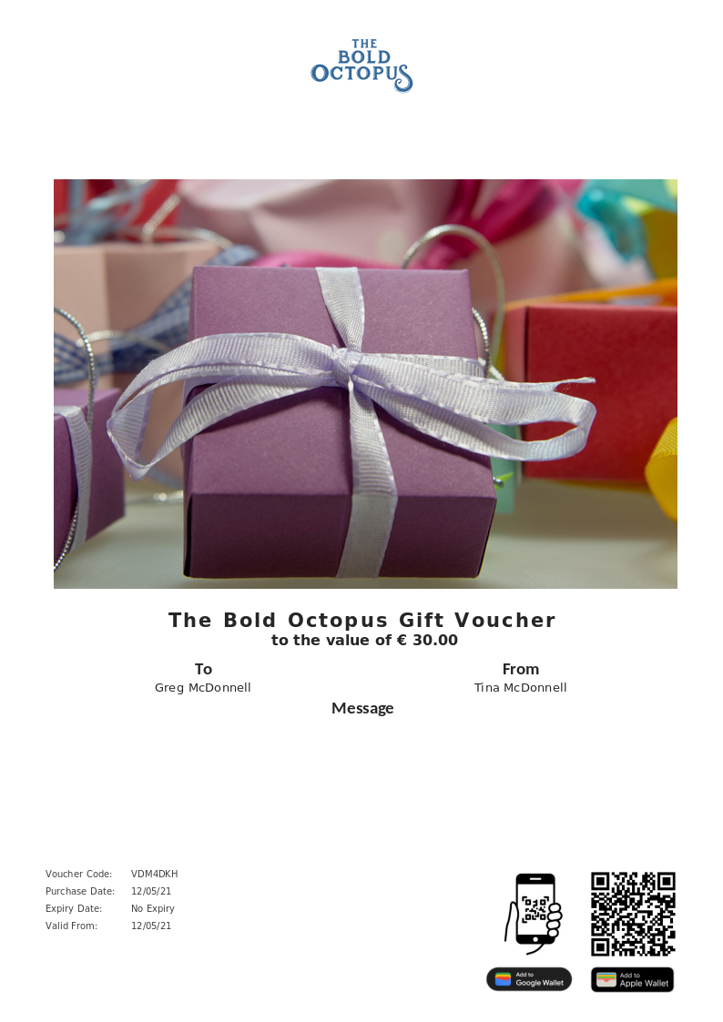 The Bold Octopus allows you to purchase instantly printable gift vouchers, special offers and tickets using the Voucher Connect platform.